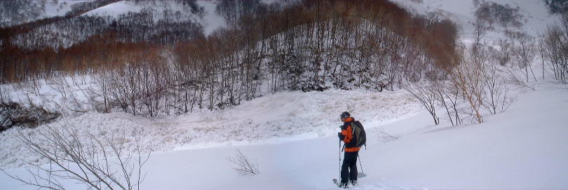 そんな遊びも林道までで、沢に入るとツボ足ではきついのでシール登行開始。