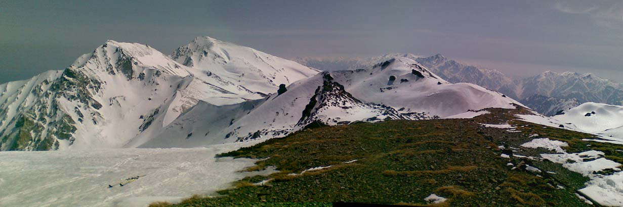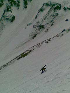 スキーの下りは、斜度のある雪渓上部では気持ち良かったが、緩やかな下部では細めの板がズブズブ雪に潜ってしまい大変困った。