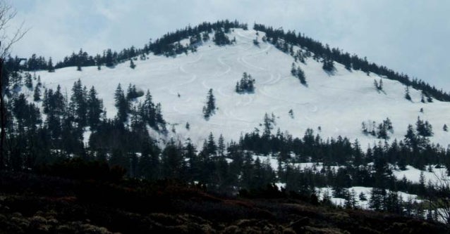 白根火山の駐車場に停めて、向かいの斜面を滑ってみた。