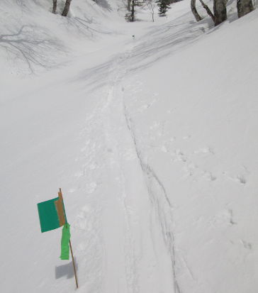 登り返して早大小屋方面に滑降。下見でゴワゴワなのを知っているので、
