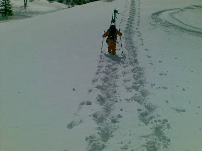 登りは、低温で固まった足場にサラサラした降雪。シールのグリップが悪い。