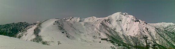携帯の自動パノラマ機能で撮ったのでズレが出ている。この日は黄砂で大分雪が黄色かった。