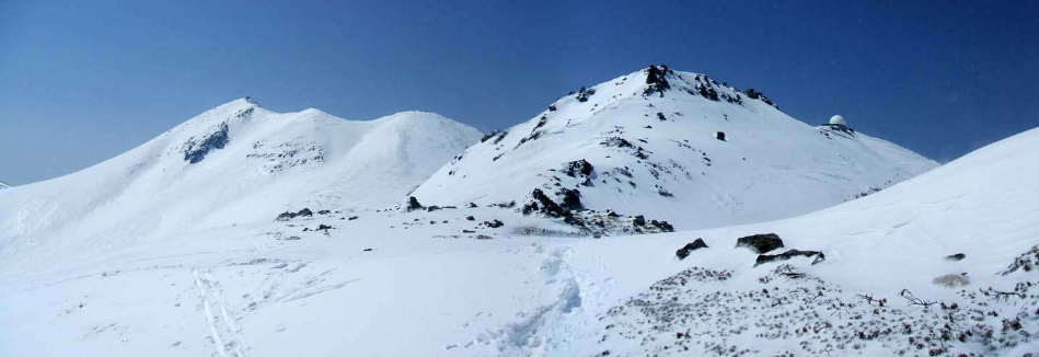 いい感じの斜面を登っていると、肩の小屋じゃなくて、宇宙線観測所の裏に出る。