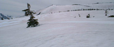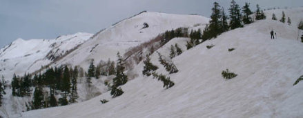4月も終わりなのに終点はこうゆう世界になっています。上では2本だけリフトが動いていました。この頃はまだ上のロープウェーは無かったのかな?記憶にない。 そこからさらにスキー場を離れ登って行き、赤い↓の所(天狗原)を目指しました。