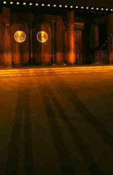 帰りに靖国神社で記念写真。影が菊の御紋に吸いこまれていく。