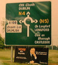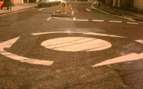 イギリスの交差点は「ROUND ABOUT」という形式を取っているものが多い。写真で見ると下のようなものです。「ロータリー」という言葉を思い浮かべる人もいるかも知れませんが、ロータリーとは呼びません。また、「ランナバウト」と憶えている人もいるが間違いです。尚、下の写真はUKではなくてアイルランドにて撮影。
