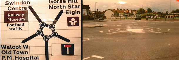 わかったつもりになっていても、突然こうゆうのに出くわすと頭を抱えてしまいます。私も最初は全然わかりませんでした。ここで、大きな円をラウンドアバウトだと思ってはいけません。大きな円は2車線の道なのだと気がつけば理解できると思います。丸い道路に小さなラウンドアバウトが5つ合体しているだけなので、一つ一つクリヤーしていけばいいのです。右の写真を見ると、クルマが逆時計廻りに走っているのがちゃんと見えるので、対面通行の丸い道路だとわかるでしょう。