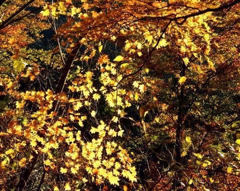 日が傾いてくると、紅葉がいっそう輝いて見える。日なたでは金色の中の山歩きとなる。