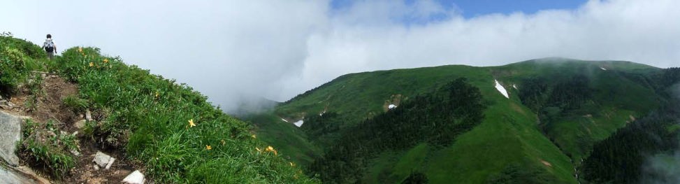 新潟の山は標高のわりには森林限界を早く超えますが、ここもまるで牧場のような風景がドバーっと広がります。
