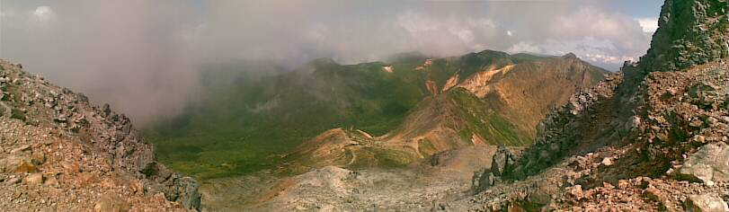 ■ 12年 茶臼岳 ■ 12年9月15日 火山のガスがモクモクと… ロープウェー山麓から歩行開始。 茶臼山頂を踏んで那須湯元まで下山。 累積高度 上昇700mくらい。 下降1370mくらい。 平面距離11キロちょっと。 3時間ちょっと。