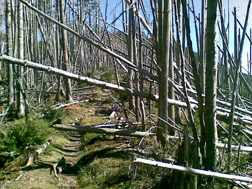 木が枯れてなぎ倒されている。
