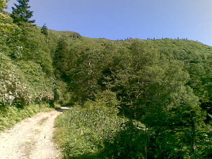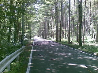バスの終点を過ぎても、富士見小屋までは車の通れる林道が通じているので快適な広さと穏やかな勾配。