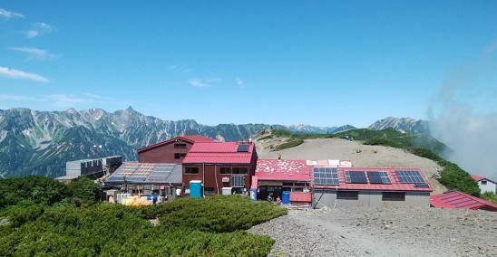 蝶ヶ岳ヒュッテは屋根にいろんなものを干していて、